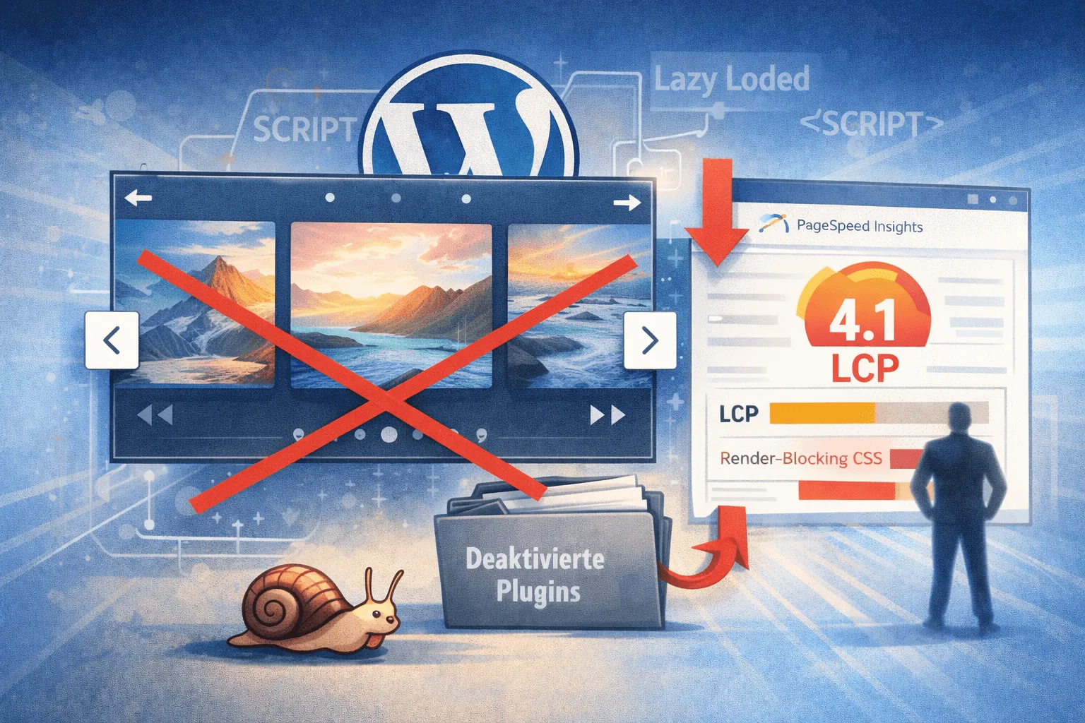 Slider bestehen scheinbar „nur“ aus Bildern und etwas JavaScript. Viele Themes liefern sie direkt mit, oft inklusive Performance-Versprechen. Also liegt der Gedanke nahe: Bilder optimieren, Autoplay aus – Problem gelöst.